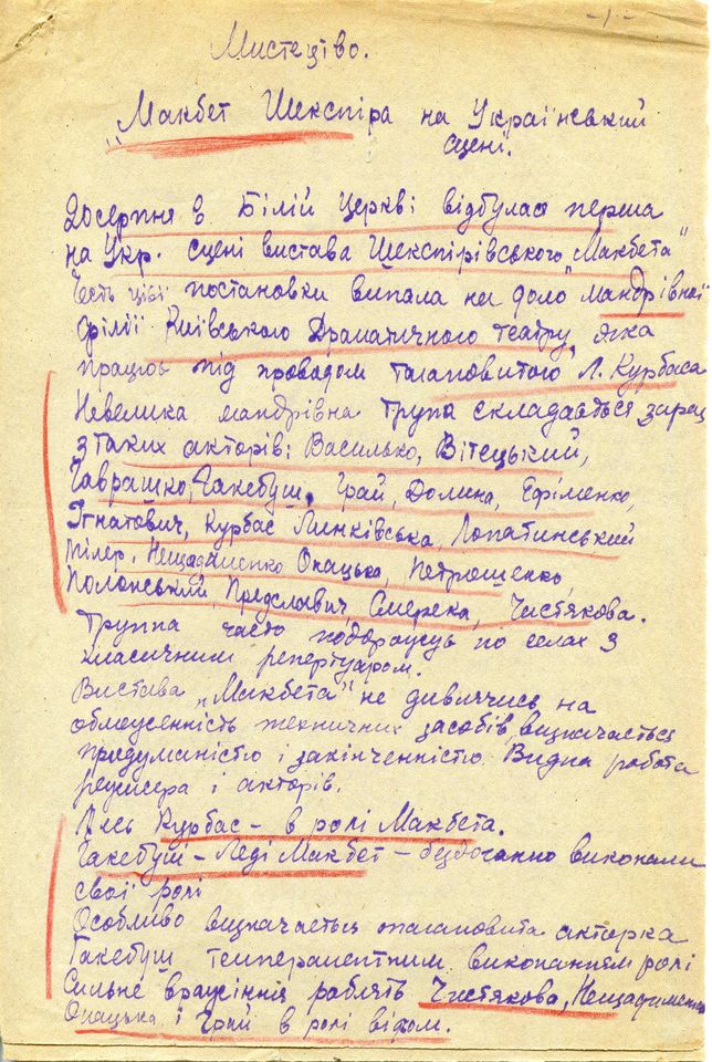 Відгук на першу в Україні постановку «Макбета» В. Шекспіра у Київському драматичному театрі.