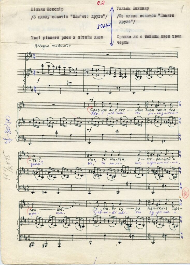 М. В. Дремлюга «Сонети Шекспіра». Романси для голосу з фортепіано. Слова В. Шекспіра. Авторизований рукопис. 1973-1974 рр. ЦДАМЛМ України, ф. 833, оп. 2, од. зб. 105, арк. 1.