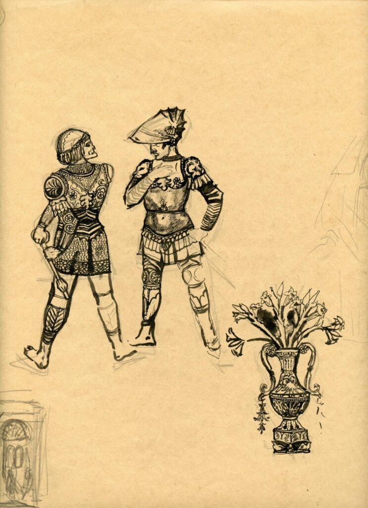 І.Л. Макарова. Ескіз оформлення вистави «Багато галасу даремно» за однойменною п’єсою В. Шекспіра. Пап., туш, олів. 1961р. ЦДАМЛМ України, ф. 967, оп. 1, од. зб. 388, арк. 5.